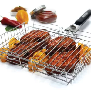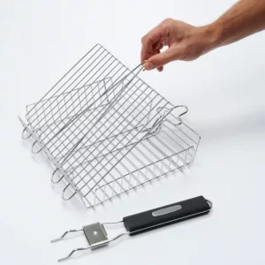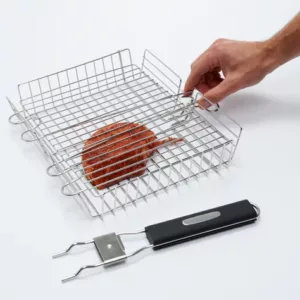 Grillkorg i rostfritt stål för grillen eller över en brasa, avtagbart handtag i värmetåligt, termoplastiskt gummi.
