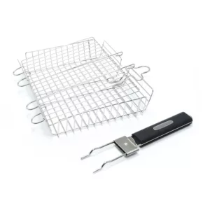 Grillkorg i rostfritt stål för grillen eller över en brasa, avtagbart handtag i värmetåligt, termoplastiskt gummi.