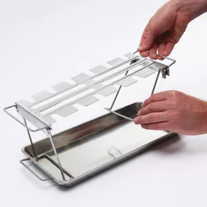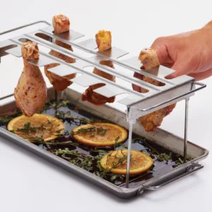 Detta vingställset i rostfritt stål är ett smart tillbehör för er som vill tillaga kycklingvingar och andra styckdetaljer med jämnt och professionellt resultat. Setet består av ett vingställ och en droppbricka, båda i rostfritt stål, där stället enkelt kan fällas ihop för smidig och platsbesparande förvaring.